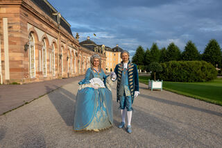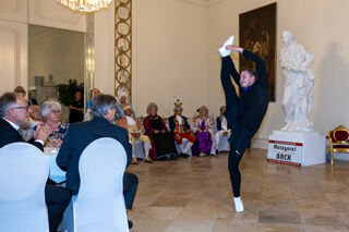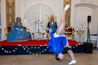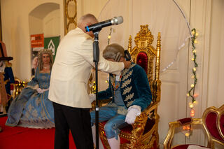 Der Hofmarschall von Schwetzingen Peter Much begrüßt die Kurfürstin von Mannheim Viktoria Luise (CDK Mannheim) stilecht mit einem Handkuss.