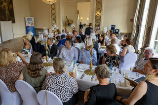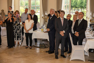 Die Gäste stehen und lauschen den Worten.