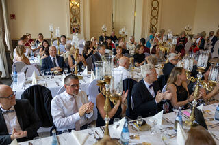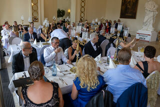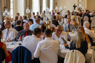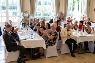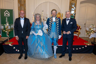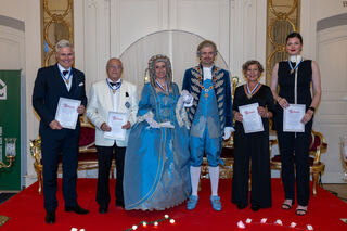 Bürgermeister Matthias Steffan gratuliert der SCG mit Klaus-Peter Münch (Ehrenvorsitzender), den Hoheiten - hier mit den Schneiderinnen Eva Seitz (Robe der Churfürstin) und Renate Cornies (Kleidung für den Churfürsten). Matthias Steffen und Klaus-Peter Münch wurden ebenfalls geehrt.