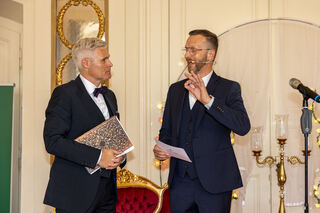 Gehören zu den Gratulanten: der Vizepräsident des baden-württembergischen Landtags, Daniel Born, und Schwetzingens Bürgermeister Matthias Steffan.