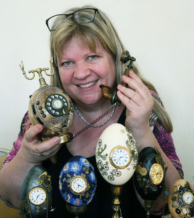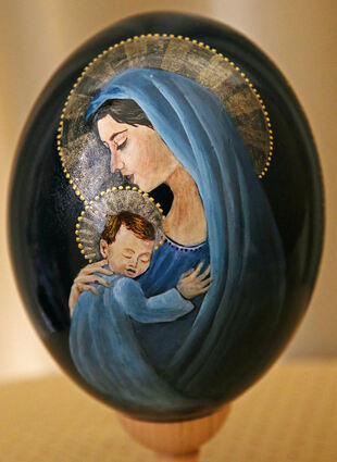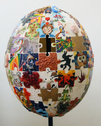 Das Ei von Kerstin Dischereit besteht aus 161 Puzzelteilen, die in über 50 verschiedenen Techniken gefertigt wurden
