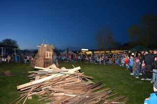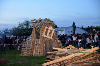 Bei Firmen gesammeltes Altholz wird zum beeindruckenden Turm gestapelt und wird wenig später lichterloh lodernd Opfer der Flammen.