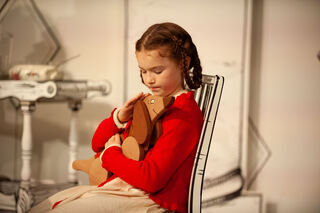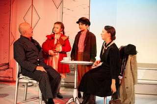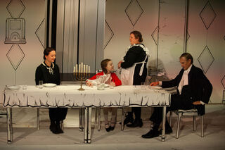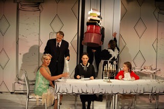 Mutter (Susan Horn) und Vater (Michael Hecht) Pogge gemeinsam mit dem Kindermädchen (Yaroslava Gorobey) und Pünktchen (Emma Mohr).