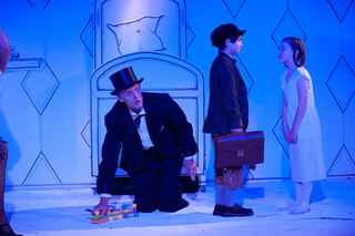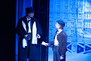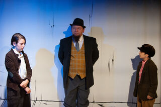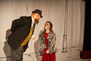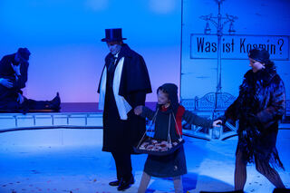 Der Verlobte Robert (Klaus Herdel) von Kindermädchen Fräulein Andacht (Yaroslava Gorobey) führt nichts Gutes im Schilde - Pünktchen (Emma Mohr mit Dackel) und Anton (Wassim Saadi) spüren das.