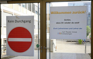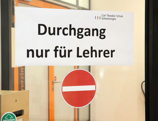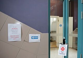 Ein- und Ausgang sind getrennt voneinander. Der Durchgang zum Hof ist gesperrt - die Pausen verbringen die Schüler in den Klassenzimmern.