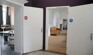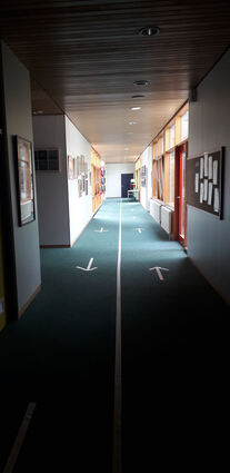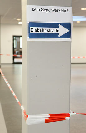 Schilder kennzeichnen, in welche Richtung die Schüler gehen sollen. So wird verhindert, dass die Jugendlichen sich entgegenkommen und nicht genügend Abstand halten können.