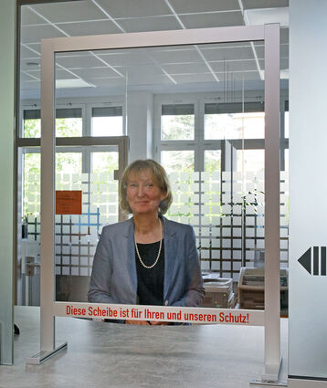 Heide-Rose Gönner, Schulleiterin der Carl-Theodor-Schule, steht im Sekreteriat hinter einer Schutzscheibe.