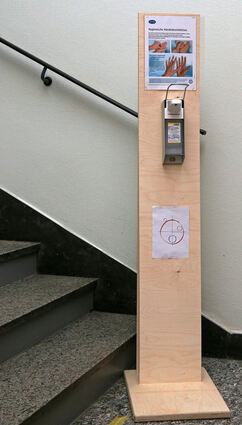 Überall im Schulhaus der Carl-Theodor- und der Ehrhart-Schott-Schule stehen Ständer mit Desinfektionsmittel.
