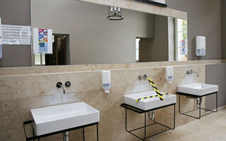 Abstandhalten auch auf der Toilette: Das mittlere Waschbecken ist gesperrt.