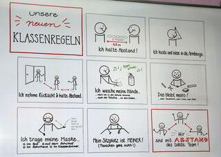 In Zeiten von Corona gelten neue Klassenregeln, die auf einem Board in der Aula des Privatgymnasiums zu sehen sind.