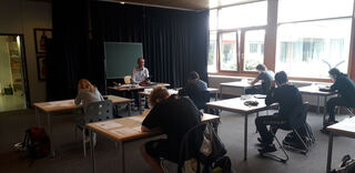 Die neunte Klasse der Kurt-Waibel-Schule wird in der umfunktionierten Aula von Lehrer Arnd Müller unterrichtet.