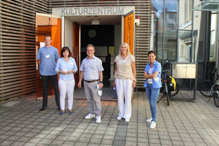 Der stellv. Schulleiter Philipp Wolfart (l.), Mitarbeiterin Ulrika Maurer, Schulleiter Roland Merkel und die Mitarbeiterinnen Ina Elter und Irini Valerga heißen die Gäste willkommen und freuen sich, dass viele der Einladung gefolgt sind.