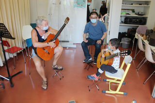 Bei Gitarrenlehrerin Claudia Helleis spielt der kleine Yixin zum ersten Mal auf dem Saiteninstrument. Papa schaut begeistert zu.