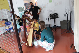 Mikail probiert zum ersten Mal im Leben die Harfe aus. Rachel Kelz (r.) zeigt ihm, wie er sie zum Klingen bringt. Die Geschwister und Papa Serkan Kaymaz freuen sich mit ihm.
