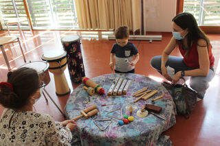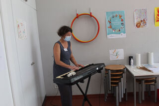 Die Fachbereichsleiterin für Elementare Musikpädagogik, Barbara Groß, begleitet die Kleinsten begeistert auf dem Keyboard, während sie verschiedene Klanginstrumente ausprobieren.