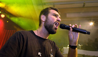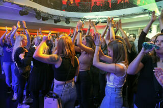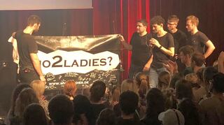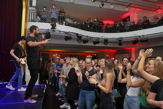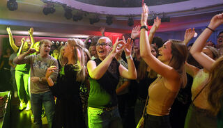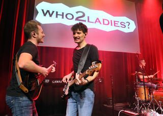 Seine Bandkollegen überreichen Kevin Solert (l.) das Banner, das die "who2ladies" zehn Jahre lang begleitet hat.