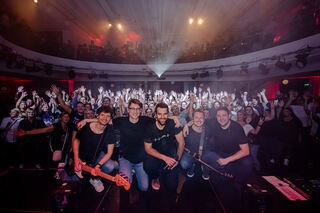 who2ladies in der Wollfabrik in Schwetzingen zum 10. Jahrestag mit Verabschiedung von Frontsänger Kevin; v. l. Adrian Laule, Patrick Weiser, Kevin Solert, Julian Wittig und Martin Weissmann.