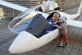 Fränk Storck ist mit seinem Enkel Luca (2,5 J.) am Stand vom SFC Schwetzingen e.V.
