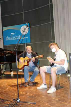 Erik Schäfer (r.) und Lehrer Gerald Weiser-Haensch rocken mit ihren Gitarren das Publikum, das sie nicht ohne Zugabe von der Bühne lässt.