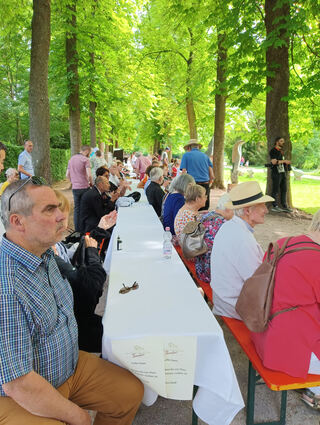 Das Publikum hat es sich im Schatten der Bäume gemütlich gemacht.