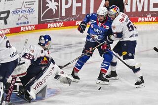 Mannheims Justin Schütz (Nr.74) gegen Muenchens Fabio Wagner (Nr.55) und Muenchens Simon Wolf (Nr.25).