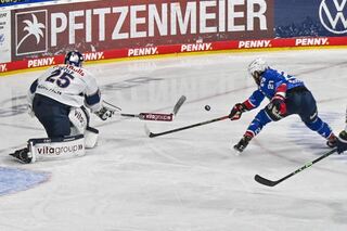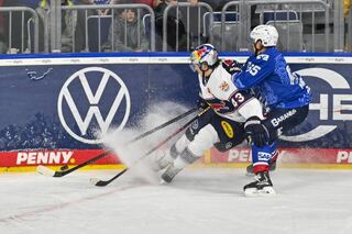 Muenchens Jeremy McKenna (Nr.91) gegen Mannheims Johan Mattsson (Nr.33).