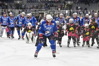Jubel nach dem Sieg v.l. Mannheims Nicolas Mattinen (Nr.52) und Mannheims Zach Solow (Nr.73).