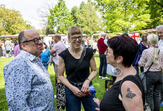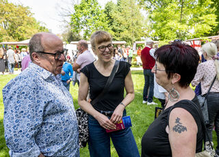 Im lockeren Gespräch rahmen der ehemalige Leiter Fachbereich 3 "Kultur, Tourismus, Bildung und Sport" Dr. Matthias Nowack und seine Lebensgefährtin Marion Kuhn seine Nachfolgerin Tanja Binder ein.