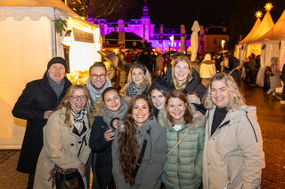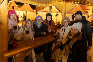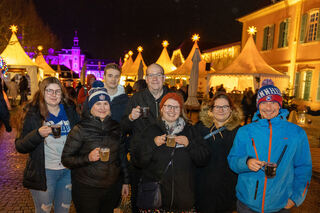 Britta, Leni, Inka, Linda,Gabi, David und Steffi aus Mannheim genießen einen Glühwein auf dem Schwetzinger Weihnachtsmarkt.