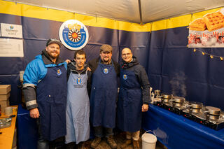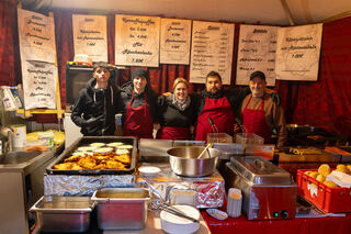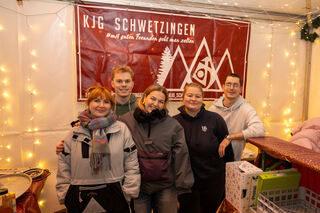 Die KJG Schwetzingen verkaufen Pulled Por, Glühwein und Punsch (vlnr) Julia-marie Schwab, Jean Haase, Saskia Schäfer, Maja Meßmer und Klaus-Peter Münch