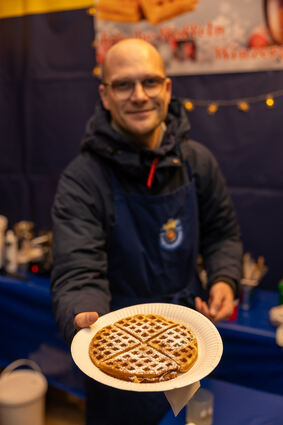 Patrick vom Round Table Schwetzingen präsentiert eine frische Waffel.