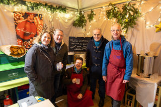 Die evangelische Kirche ist auch auf dem Schwetzinger Weihnachtsmarkt vertreten: (Vlnr) Hanni Derr, Michael Hampel, Holger Hamm, Helmut Erny und Hans-Ludwig Schneider.