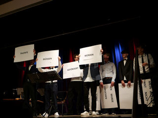 Die Schüler betreten während der Rede des Schulleiters mit Plakaten die Bühne...