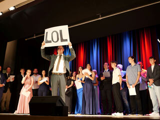 Schulleiter Martin Jendritzki macht den Spaß auf der Bühne mit.