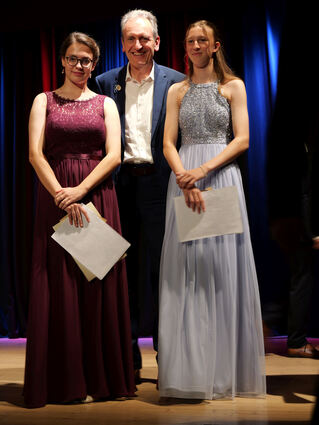 Bürgermeister und Schulverbandsvorsitzender Dr. Ralf Göck gratuliert den beiden Jahrgangsbesten Lara Zoe Winkelvoß (links) und Sophie Kukuk.