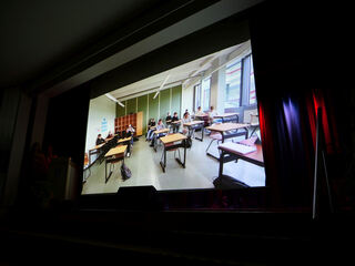 Auf der Leinwand zeigen die Schüler gemeinsame Momente aus der Schulzeit.