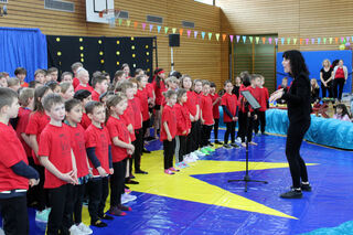 Unter der Leitung von Anne Kathrin Bade singen die Kinder der Jahnschule zur Begrüßung.