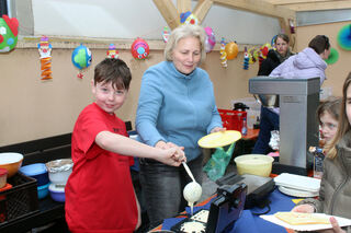 Auch auf dem Platz neben der Jahnhalle wird einiges geboten, wie hier am Waffelstand. Schüler Fabian Gölz hilft fleißg, bevor er auftritt. Auch Mitarbeiterinnen des "Hort am Turm" helfen gern, wie Antonina Schröder.