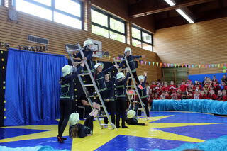 Die Feuerwehrleute balancieren gekonnt auf ihren Feuerwehrleitern.
