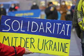 Auch in Heidelberg zeigen Demonstraten bei einer Kundgebung ihre Solidarität mit der Ukraine nach dem Angriff durch Russland.