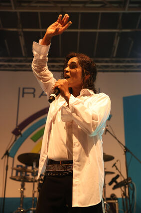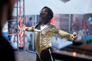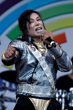 Michael Jackson alias Koffi Missah ist begeistert von der feiernden Menge vor der Bühne.