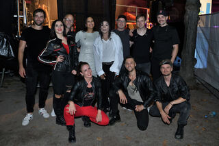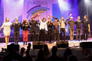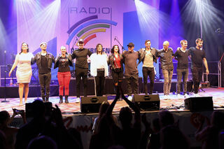 Die Protagonischen stellen sich nach dem Konzert noch einmal zusammen: Johannes Zeiss, Katharina Dorochow, Mirco Leingang, Lisa Benjamin, Koffi Missah, Andy Keller, Jan David, Valentin Findling, (vorne) Sabine Ballasch, Misha Tovt und Nikolaj Rohloff.