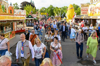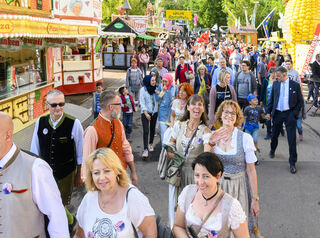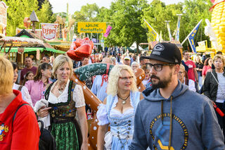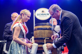 Brezelkönigin Laura Hölzl, der Geschäftsführer der Brezelfest Veranstaltungs GmbH und der Vereinsvorsitzende Uwe Wöhlert zapfen Bier.