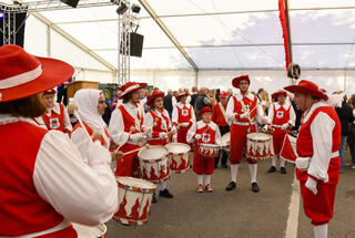 Der Fanfarenzug Rot-Weiß Speyer zieht mit klingendem Spiel auf den Platz ein.