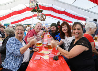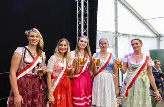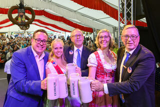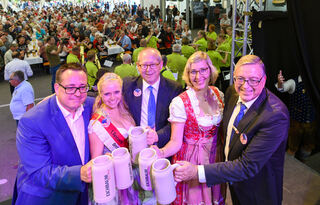 Der Repräsentant der Eichbaum-Brauerei Jochen Schneider, Brezelkönigin Laura Hölzl, der Geschäftsführer der Brezelfest Veranstaltungs Gmbh Claus Rehberger, OB Stefanie Seiler und der Vereinsvorsitzende Uwe Wöhlert stoßen auf das Fest an.