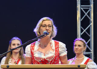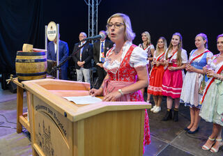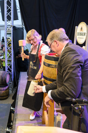 OB Stefanie Seiler darf das Bierfass vom Vereinsvorsitzenden Uwe Wöhlert assistiert zur Eröffnung anschlagen.