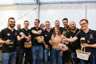 Der Repräsentant der Eichbaum-Brauerei, Jochen Schneider, Brezelkönigin Laura Hölzl, der Geschäftsführer der Brezelfest Veranstaltungs GmbH, Claus Rehberger, OB Stefanie Seiler und der Vereinsvorsitzende Uwe Wöhlert stossen auf das Fest an.