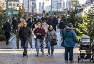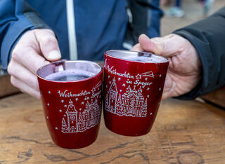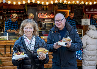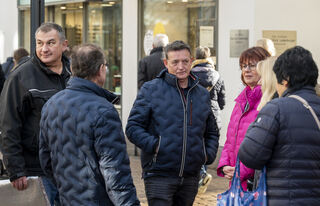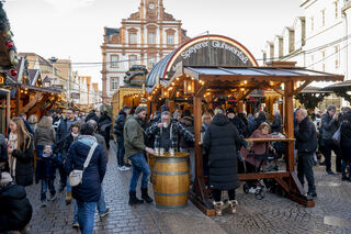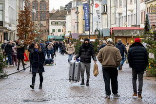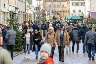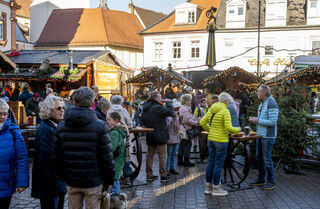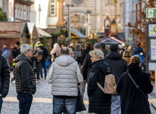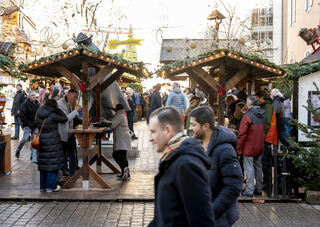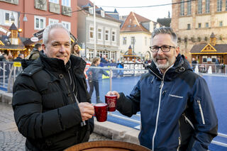 Der Bereich vor dem Altpörtel ist voll. Auf dem Platz baut Schausteller Freddy Zinnecker einen kleinen Weihnachtsmarkt mit Schlittschuhbahn auf und Michael und Markus genießen gerne eine Tasse Glühwein.