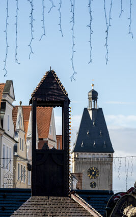 Ein Türmchen eines der Stände auf dem Markt bildet eine gute Kulisse für den am Ende der Maximilianstrasse herausragenden Stadtmauerturm Altpörtel.