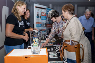 Es gibt auch einen Merchandise-Stand der "Hiwwe wie driwwe"-Filme. Die Gäste kaufen Dubbegläser und Tassen mit Elwetritsch drauf oder T-Shirts mit dem lustigen Wort "Schnickelfritz" drauf, das soviel wie "schelmischer Kerl" bedeutet, aber auch Kosename sein kann.